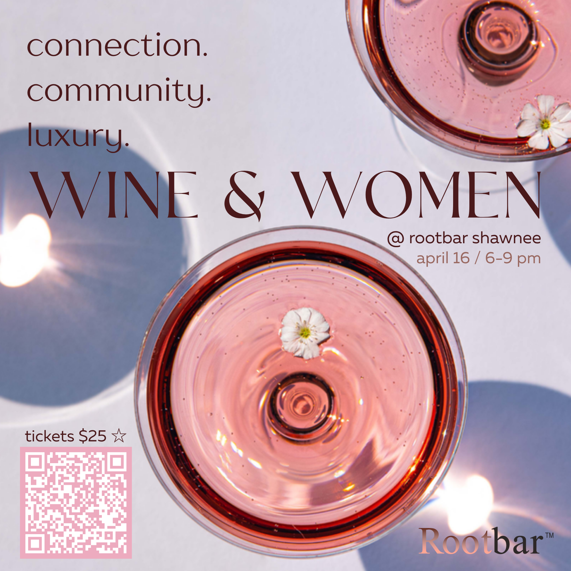 Wine & Women will be hosted at Rootbar Shawnee on Thursday, April 16 from 6-8 pm. Your $25 ticket includes a complimentary drink and a charcuterie cup.